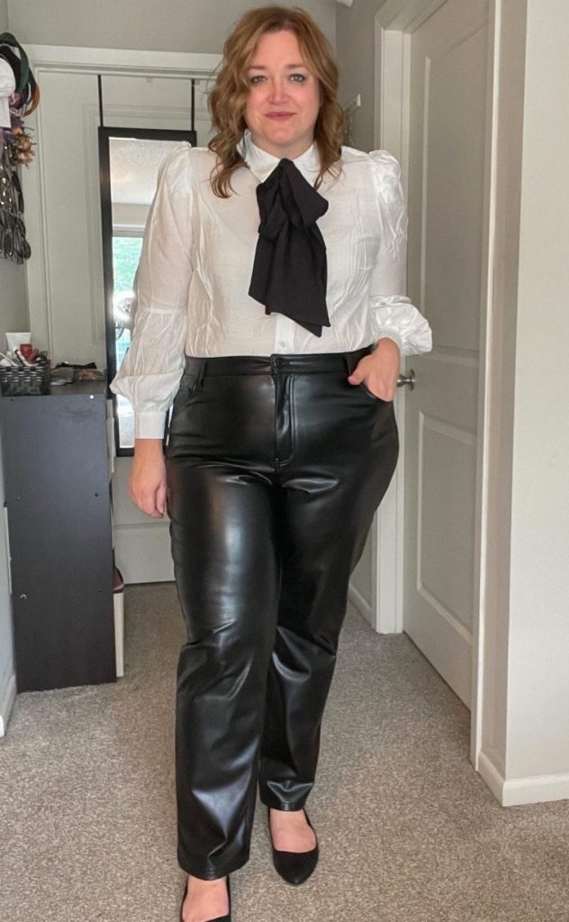 I love a tie neck blouse as previously discussed. There is just something so classic about the black and white contrast and by adding the faux leather pants to this look I think it adds all the right notes.